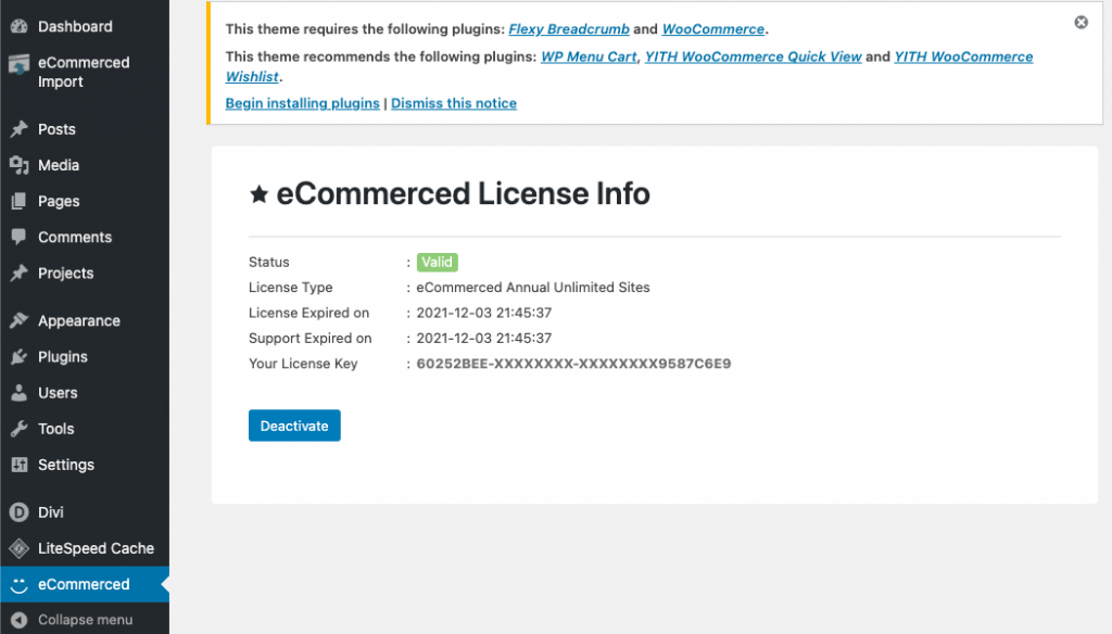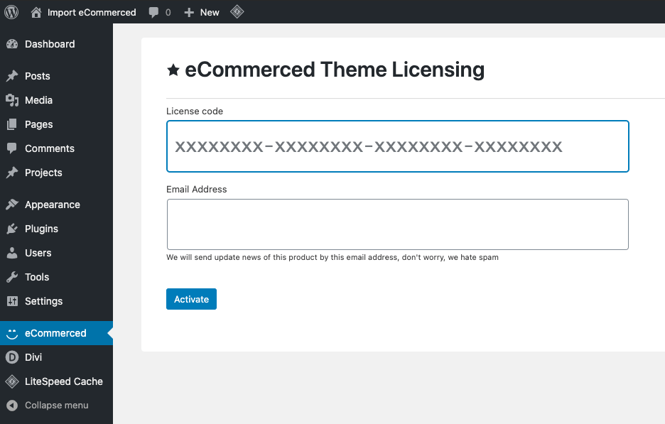 3B. If you bought eCommerced at https://www.beta.divided.rocks/, first activate the license. To do this enter the license key you received in your email or download it from your Account page. You will only see this if you bought the theme directly from our website, not when you bought it from Elegant Themes website.